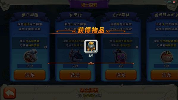 4、探索完成后左下角会出行提示领奖,点击进入后即可领奖。奖励范围:金币500~10000,宝石2~25,福利龙蛋、高级龙蛋