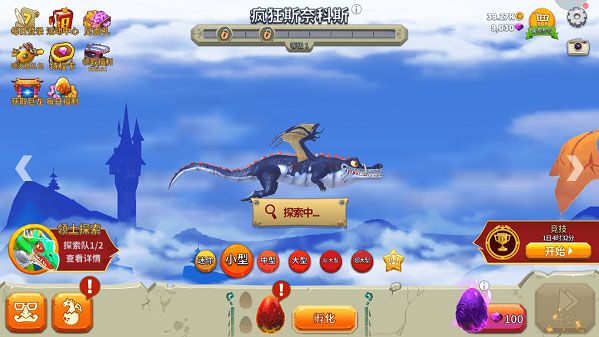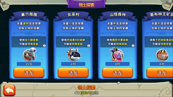 2、进入领土探索界面,即可根据任务要求选龙、皮肤和宠物,可参与的龙尺寸有: “迷你” 、“小”、“中”、“大”、“巨大”、“超大”