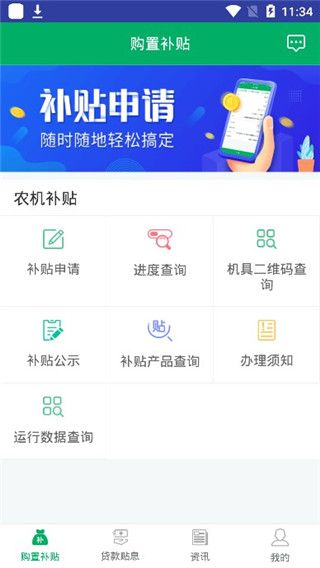 1、打开在本站下载的河北农机补贴最新版本,进入软件首页,在购置补贴页面中我们可以看到有补贴申请、进度查询、机具二维码查询、补贴产品查询等等;
