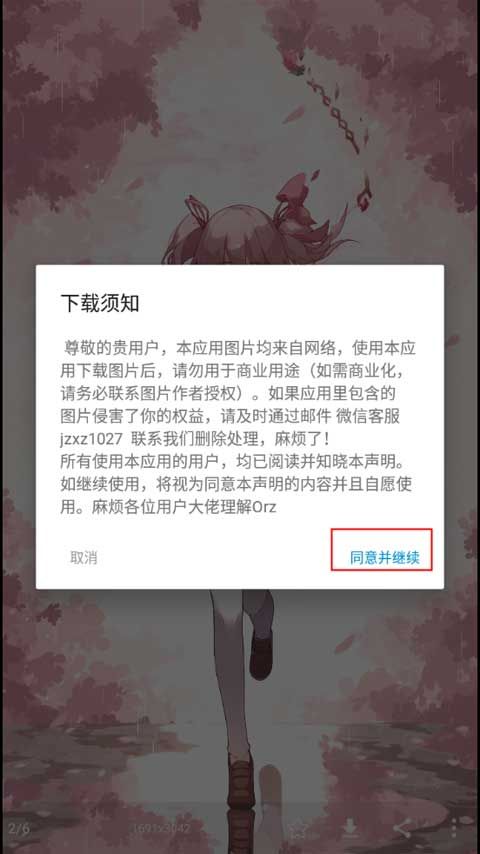 2、等待壁纸加载完毕之后点击下方的下载按钮获取图片资源,点击同意并继续。