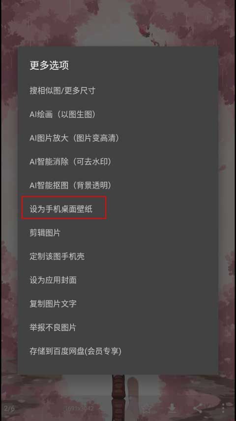 3、下载好了以后就点击右下角的三点图标,选择“设为手机桌面壁纸”。也可以在我的相册中将壁纸设置为动态锁屏壁纸。