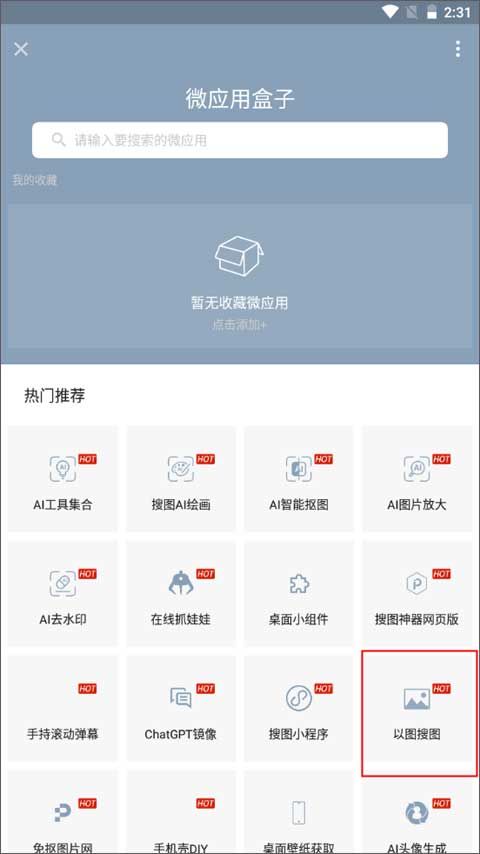 2、在微应用盒子中找到热门推荐板块,选择以图搜图功能选项。