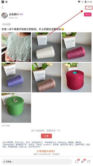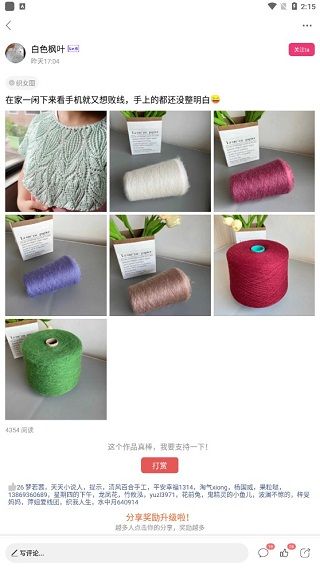 回到首页,不同的标签类别下展示了大量手工编织的作品,点击进入,可以关注你喜欢的原创者,可以撰写评论,也可以参与聊天互动,还能点赞、打赏和转发。