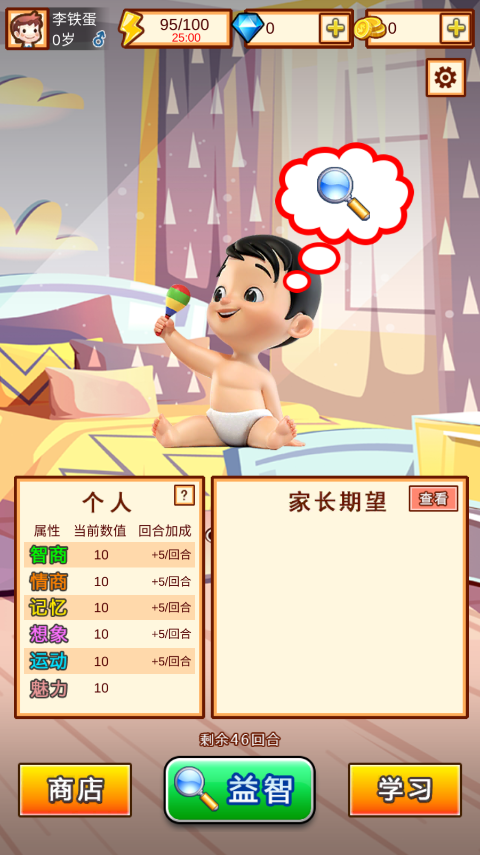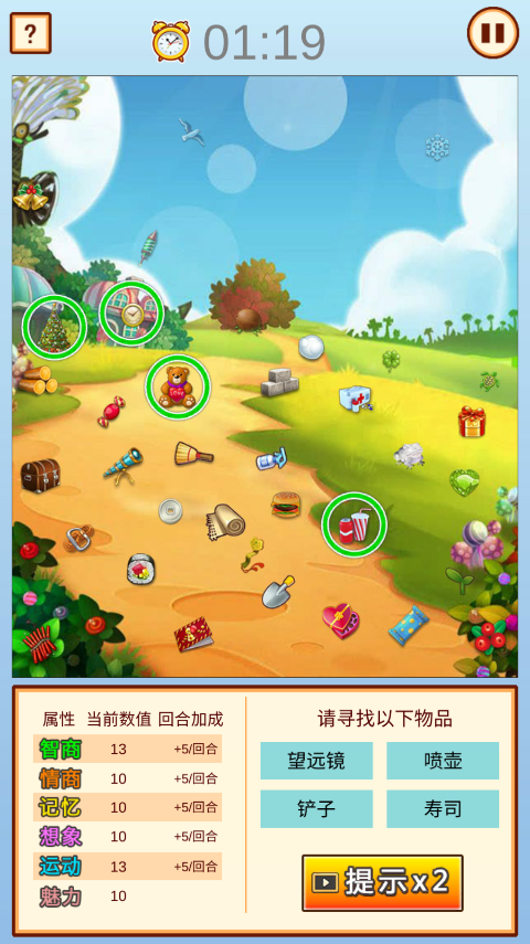 3、点击寻找到右下角显示的物品即可过关提高智商、情商、记忆、想像、运动和魅力的回合加成。